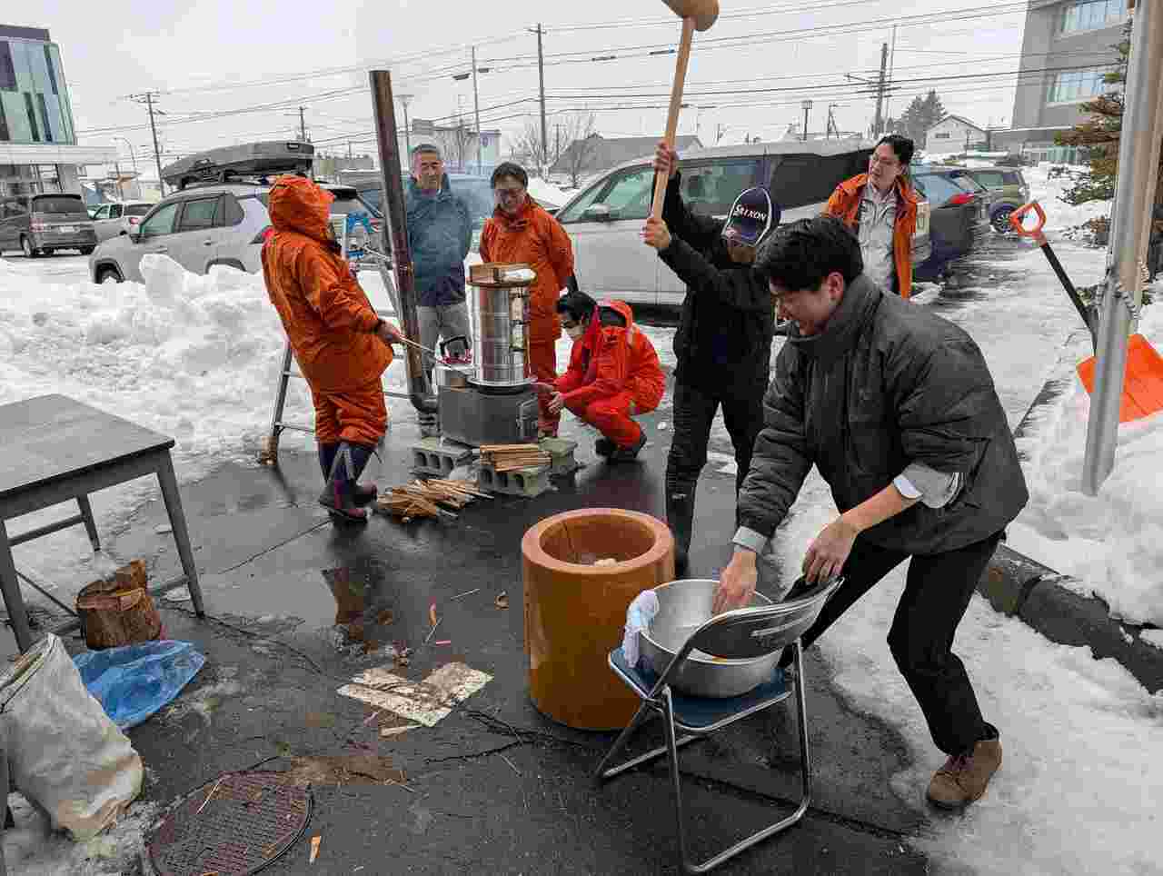 薪ストーブに蒸篭(せいろ)を乗せて、もち米を蒸し上げてからの行う本格的なお餅つき、おしるこや納豆、きなこなど様々な種類を作り食べました。
