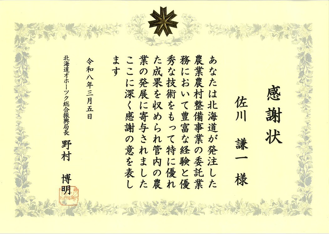 当社社員の佐川 謙一が、令和8年3月5日にオホーツク総合振興局、令和8年3月13日に宗谷総合振興局より委託業務において、優れた成果を挙げ農業の発展に寄与したことが認められ、感謝状が授与されました。